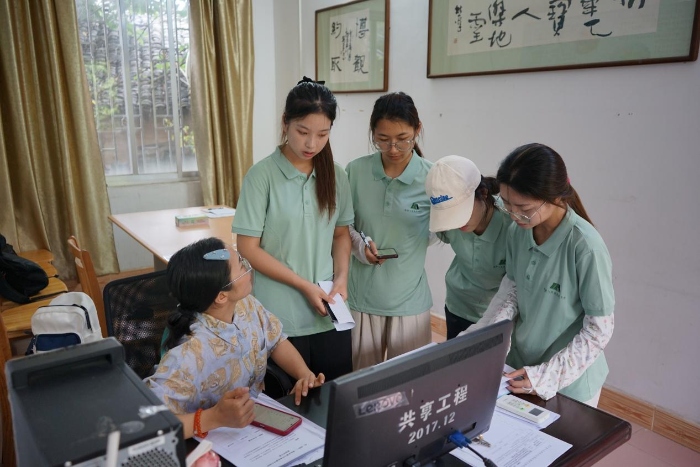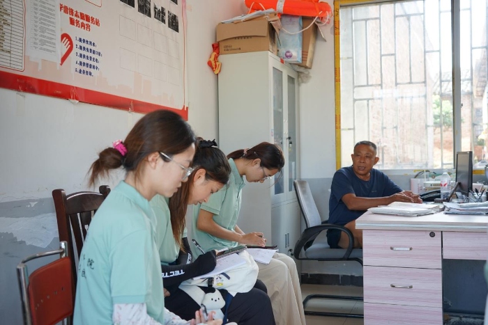 圖為實(shí)踐團(tuán)隊(duì)與工作人員共同翻閱相關(guān)資料