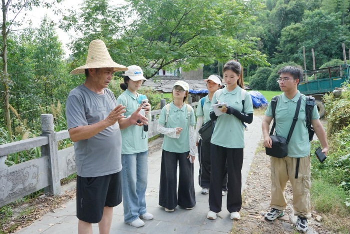 圖為團(tuán)隊(duì)成員向村民了解古道歷史