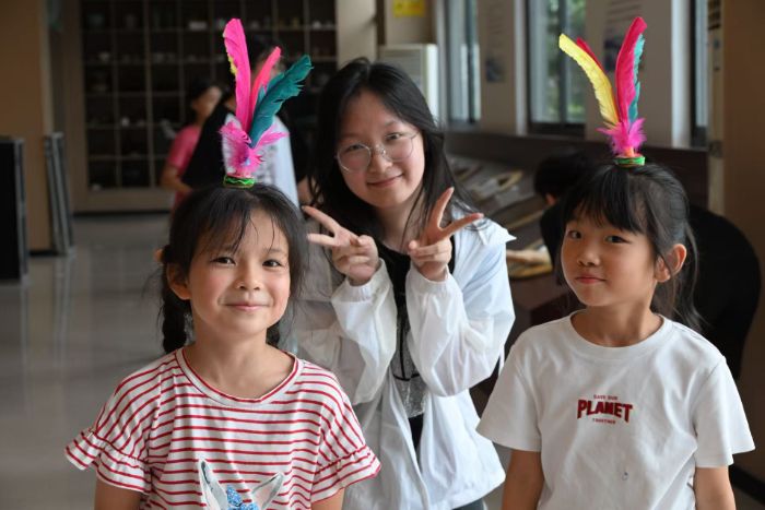 我負(fù)責(zé)的第一節(jié)課是“指尖非遺,千年剪影工坊”,帶領(lǐng)孩子們了解剪紙這項(xiàng)非遺技術(shù),也自己動(dòng)手合作剪出自己的福字與金魚(yú)作品。他們的剪法很稚嫩,但每一張臉上都顯露著認(rèn)真,在無(wú)形中進(jìn)行文化的傳承。"祖國(guó)旗幟在我心"課程里,我?guī)Ш⒆觽冇涀×藝?guó)旗、黨旗、軍旗、團(tuán)旗和隊(duì)旗這些重要旗幟,了解旗幟背后的故事,用彩紙制作迷你國(guó)旗。每一次介紹代表中國(guó)共產(chǎn)黨的五角星,一遍遍加深了永遠(yuǎn)跟黨走的團(tuán)結(jié)意識(shí),這正是思政課落實(shí)的意義所在:比起教知識(shí),更要播撒認(rèn)同的種子。在紅色詩(shī)朗誦課上,《紅色脊梁》的自豪與激昂,從孩子們奶聲奶氣的吟誦中迸發(fā)出來(lái),竟有了穿透時(shí)空的力量——原來(lái)紅色基因的傳承,從不需要刻意說(shuō)教,只需要讓他們自己去聽(tīng)歷史的回響。每一節(jié)課總會(huì)發(fā)生一些小插曲,與預(yù)演備課的進(jìn)程不同,往往一節(jié)課許多環(huán)節(jié)需要幾個(gè)老師一起上,不過(guò)在隨機(jī)應(yīng)變的調(diào)整后,也取得了圓滿(mǎn)成功的效果。