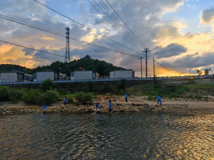 兩周的時光就這樣在累積起來的無數(shù)平凡又動人的瞬間中度過,都說農(nóng)村的生活是慢節(jié)奏的,但我常常希望這樣的時間再過得慢一點,即使我抓不住這些逝去的時間。在最后的結(jié)營儀式里,我看著孩子們表演歌曲與朗誦時認(rèn)真又賣力的神情,復(fù)雜的情緒溢滿了我的整個內(nèi)心,那是在前幾天里每次排練時生怕來不及教學(xué)的緊張,是看著孩子們即使不認(rèn)識字也努力排練的感動,是在演出時感受到孩童們能積極展現(xiàn)自己的欣慰;是孩子們、老師們、家長們的三方配合,使這場結(jié)營儀式完美結(jié)束。在最后一天晚上的傍晚,我們終于下了水,在大山腳下的小溪里,我們抓小魚,逗弄成群的大鵝和小鴨子,周圍是響亮的蟬鳴,耳邊是朋友們閑聊的私語,我本以為我們的支教生活會在這樣靜謐的時刻里度過,但事實卻更震撼人心。再次抬頭,入目的已經(jīng)是日暮時分的橙黃色晚霞,在三面大山一面居民房的映襯下,這晚霞是廣闊的,是靜謐的,是油畫里塑造的璀璨圖。孩童們不知從哪接受的消息,在岸邊叫著“老師們,我們來了!”他們在家長的同意下也下了河,不知是誰先潑的水,我們竟和孩子們打起了水仗,在天黑前的一個小時里,我們是那樣的肆意,那樣的歡樂,那樣的自由,大山里響徹的是我們的尖叫與歡笑,我想,這一個小時是獨屬于我們的,獨屬于志愿者們與孩子們的,獨屬于“追光”的。在這場看似狂歡其實不舍的告別儀式中,我們在第二天離開了這個背靠大山的小村子,但我想,我永遠不會忘了這樣的時刻,永遠。