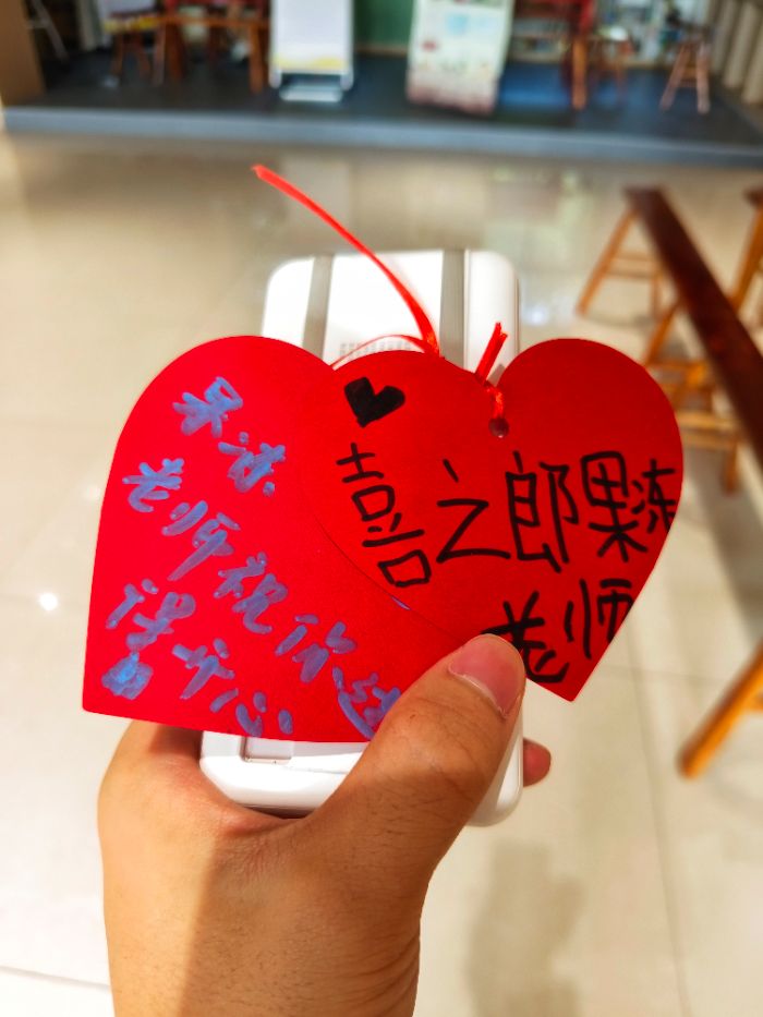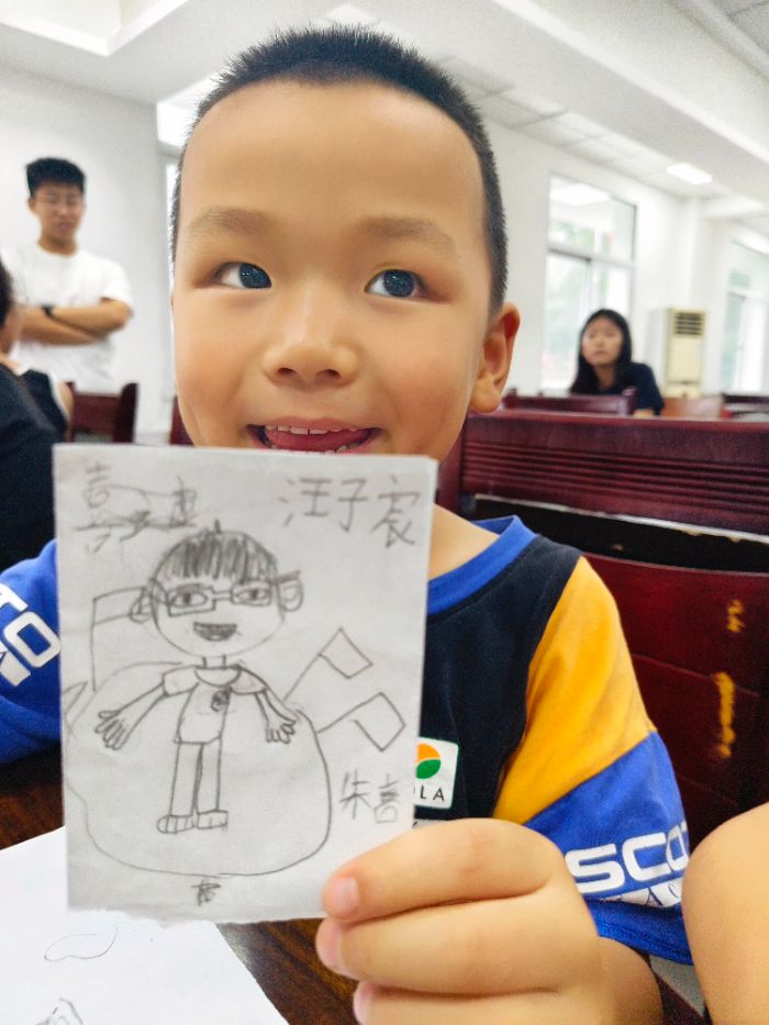 現(xiàn)在還依然記得“四小只”的故事呢。第一天自我介紹時(shí),我告訴孩子們可以叫我“喜子老師”,后面下去輔導(dǎo)功課時(shí),他們四小只坐在一起,我輔導(dǎo)完他們的作業(yè)后,突然想問(wèn)問(wèn)他們記不記得我叫什么老師,其他三個(gè)人都回答對(duì)了(當(dāng)時(shí)聽(tīng)到的時(shí)候既驚訝又高興,畢竟我只介紹了一遍就能記住,更何況還有其他那么多老師呢),唯獨(dú)二寶,他可能因?yàn)榭谝舻脑颍盐医谐闪?ldquo;喜之郎老師”。他這話一出,另外三小只也都在那里邊笑邊重復(fù)念叨著“喜之郎老師”——從此,“喜之郎老師”“喜之郎果凍老師”等稱(chēng)號(hào)在孩子們之間廣泛流傳?,F(xiàn)在想來(lái)一切都正正好,在正式開(kāi)課前,我們還去鎮(zhèn)上的商場(chǎng)采買(mǎi)一些生活物品時(shí),我就曾看中了一款超大型果凍(雖然最后還是沒(méi)買(mǎi))。“喜之郎老師”,嗯,感覺(jué)挺不錯(cuò)的,念起來(lái)也朗朗上口呢。