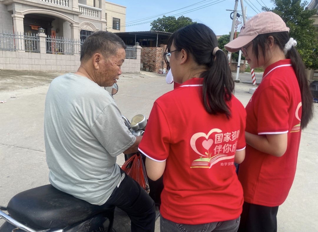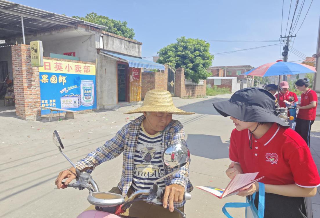 除此之外,隊(duì)員們依托田頭圩內(nèi)主干道這一村民日常出行的重要路徑,開(kāi)展流動(dòng)宣講活動(dòng)。隊(duì)員們沿著主干道緩慢行進(jìn),通過(guò)吆喝資助政策要點(diǎn),同時(shí)隨手配備宣傳資料,向過(guò)往村民面對(duì)面講解資助范圍、申請(qǐng)條件、辦理流程等內(nèi)容,讓惠民政策更直接、更便捷地觸達(dá)每一位村民。遇到街邊納涼的胡姨,我們主動(dòng)遞上《廣東省學(xué)生自主政策簡(jiǎn)介》,簡(jiǎn)單講解“獎(jiǎng)、貸、助、勤、免、補(bǔ)”等八大資助政策。胡姨表示:“這國(guó)家政策好啊,正好我們家里出了兩個(gè)大學(xué)生,我和他們說(shuō)啊。”