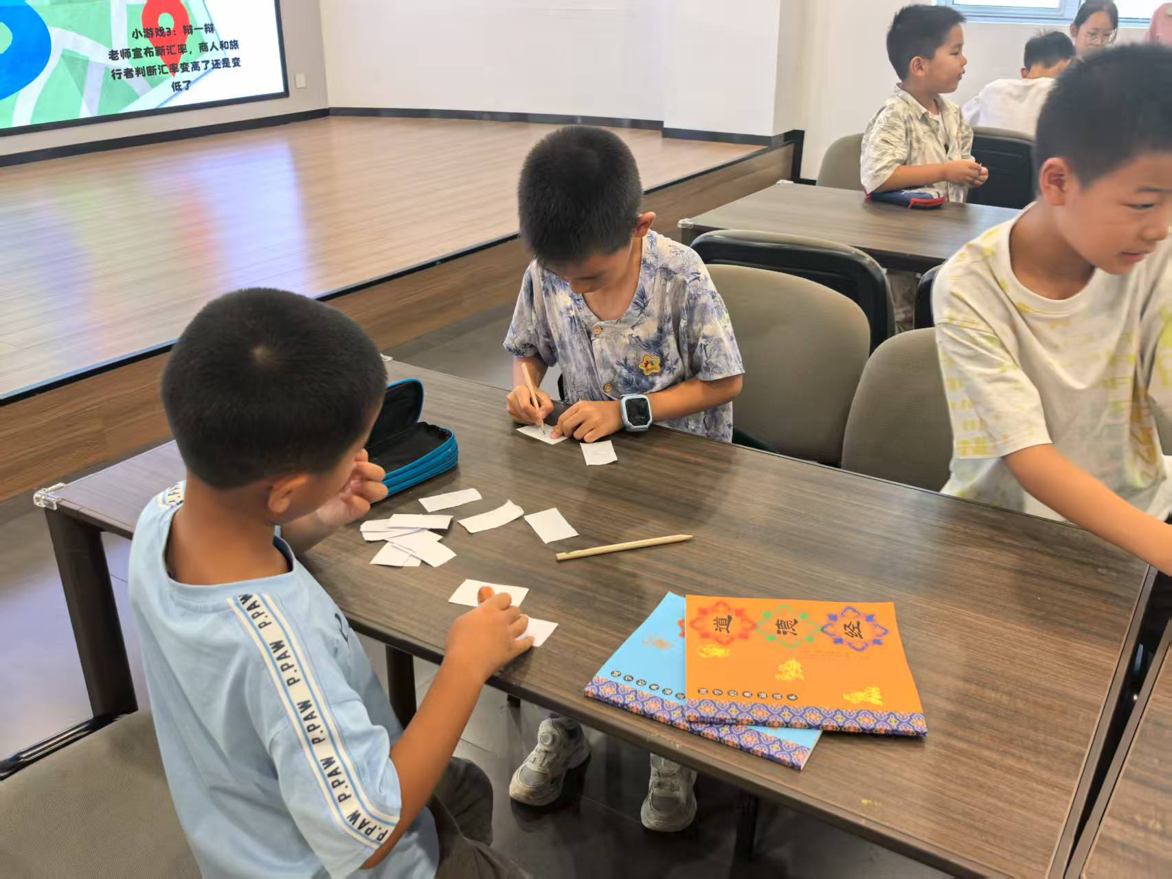 在整個(gè)講解過(guò)程中,孩子們始終保持著高度的專注,眼中充滿了對(duì)知識(shí)的渴望。不少孩子積極舉手提問(wèn),成員一一耐心作答。許多孩子還在筆記本上認(rèn)真地記錄著貨幣發(fā)展的相關(guān)內(nèi)容,還有孩子在旁邊畫(huà)出了貝殼、銅錢和人民幣的圖案。在這樣活躍而輕松的課堂氛圍中,孩子們對(duì)貨幣有了更為深刻的認(rèn)識(shí),這也為后續(xù)實(shí)踐活動(dòng)做了充分的知識(shí)準(zhǔn)備。