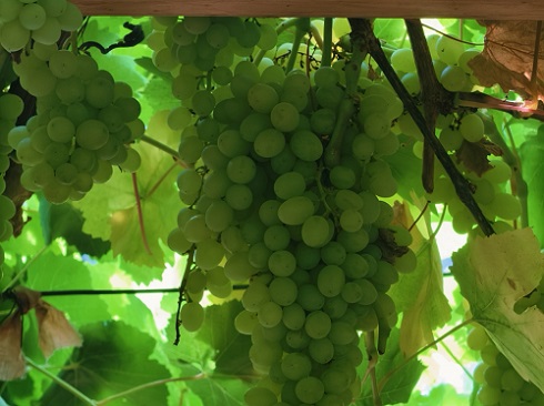 (圖為葡萄溝種植園內(nèi)成熟的葡萄串,晶瑩剔透的果實掛滿藤架)