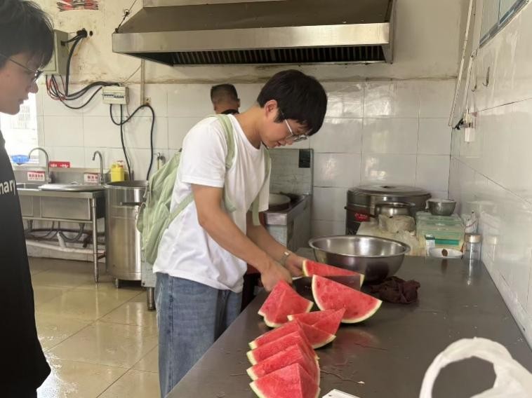 圖為志愿者服務(wù)團(tuán)隊(duì)成員幫老人切西瓜。攝影:高潔;