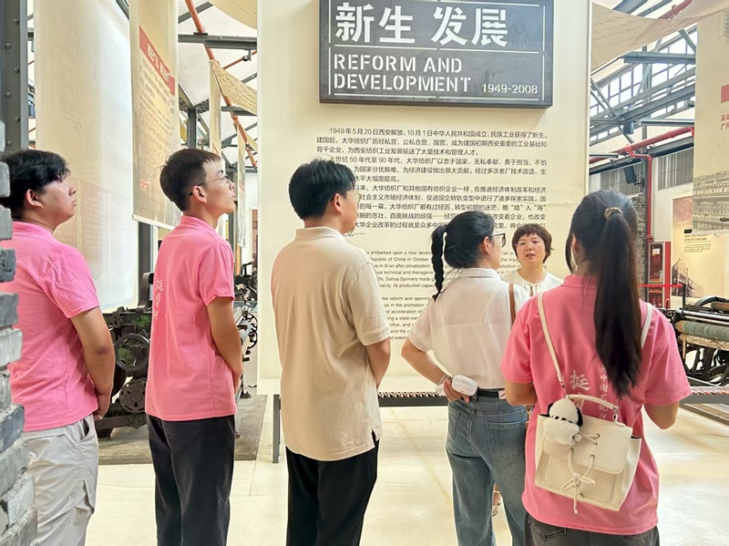 西安大華 1935 博物館依托長安大華紡織廠老舊廠房改造而成,通過史料文獻、實物展陳、歷史圖片、場景復(fù)原及多媒體互動等多元形式,全景展現(xiàn)了長安大華紡織廠從 “興建創(chuàng)業(yè)” 到 “新生發(fā)展” 再到 “鳳凰涅槃” 的百年歷程。跟隨講解員的腳步,師生們逐一參觀展廳,認真聆聽這段跨越世紀的工業(yè)史詩:從 1935 年建廠時的艱辛拓荒,到抗戰(zhàn)時期支援前線的熱血擔(dān)當(dāng);從新中國成立后領(lǐng)跑西北工業(yè)的飛速崛起,到面對時代浪潮主動轉(zhuǎn)型的勇毅探索。銹跡斑斑的老機床、泛黃的生產(chǎn)報表、磨損的工作證…… 每一件老物件、每一張舊照片都在無聲訴說著波瀾壯闊的歲月,讓在場師生深切體會到民族工業(yè)的堅韌底色與先輩們的奮斗精神.
