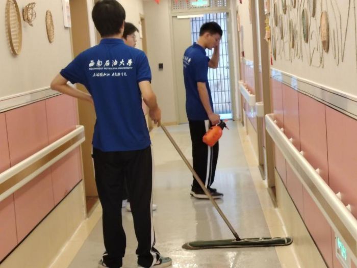 圖為實(shí)踐隊(duì)成員們正在認(rèn)真清掃養(yǎng)老院走廊。吳欣逸供圖