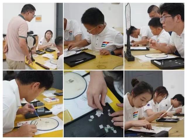 隨后,實踐團前往制作車間,近距離觀摩螺鈿漆扇全流程制作。匠人們專注于每道工序——切割、打磨、髹漆、鑲嵌,每一步都凝聚著技藝積淀與文化精神。作為揚州漆器代表性技法,螺鈿工藝以珍珠貝、云母等天然材料為原料,磨成薄片后按圖案精準(zhǔn)切割,再鑲嵌入漆面,呈現(xiàn)出熠熠生輝的畫面。工作人員一邊操作一邊講解:“切割要穩(wěn),鑲嵌要準(zhǔn),哪怕一點偏差,整體美感就會失衡。”