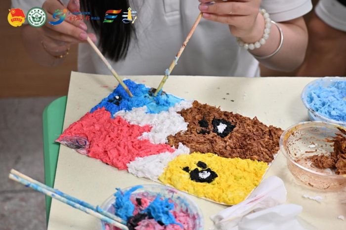 制作紙漿時,突擊隊隊員戴小雨跟同學(xué)們講解,“不同顏色的紙漿要分開存放,尤其是深色和淺色,否則容易串色,影響圖案的清晰度。” 她還示范了膠水的添加比例,當(dāng)膠水與紙漿的比例大概在 1:5時,既能保證粘性,又不會讓作品干后起皺。” 孩子們聽得專注,時不時點(diǎn)頭回應(yīng),手上的動作也更加謹(jǐn)慎。