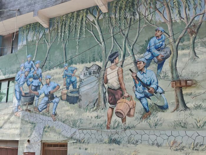 青山遇上“紅楓”,深掘紅色文化楓香溪鎮(zhèn)作為賀龍、夏曦、關(guān)向應(yīng)等革命先驅(qū)的戰(zhàn)斗之地,不僅是一個(gè)被青山懷抱的秀美明珠,更是一座有著深厚紅色文化底蘊(yùn)的紅色小鎮(zhèn),一磚一瓦都訴說著革命先烈的英勇事跡。田夢(mèng)支教團(tuán)成立相關(guān)調(diào)查小組,深入挖掘楓香溪的紅色基因。他們走進(jìn)楓香溪會(huì)議會(huì)址紀(jì)念館,從諸多承載紅軍革命精神的物件體悟革命精神。此外,他們也在探訪紅三軍軍部及政治部舊址、紅七師舊址與紅軍醫(yī)院等一系列楓香溪紅色文化舊址中深刻感受到獨(dú)屬于革命歲月的厚重與激情。楓香溪的“紅底色”并非僅藏匿在紀(jì)念館與博物館中,田夢(mèng)支教團(tuán)在調(diào)研過程中,經(jīng)??梢钥吹郊脑⒓t色故事的墻繪,它們不僅是當(dāng)?shù)睾⒆觽兗t色教育的“啟蒙書”,也是楓香溪紅色文化鮮活的“明信片”。