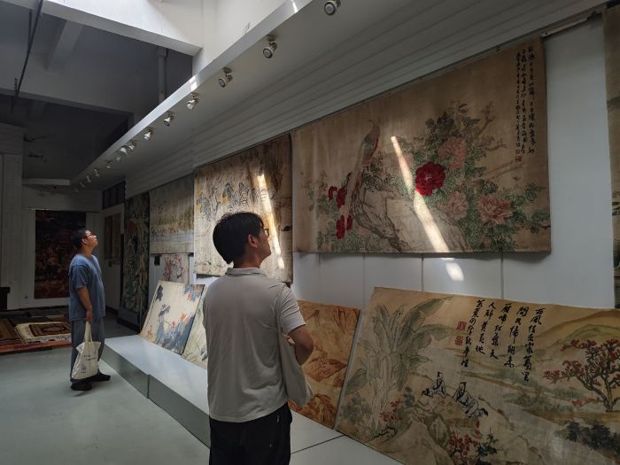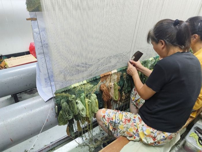 8月7日,團(tuán)隊(duì)深入如皋絲毯藝術(shù)博物館。一幅幅流光溢彩的絲毯杰作,以百萬計的“8”字手工繞結(jié)與精妙絕倫的剪花工藝,無聲訴說著“一寸絲毯千寸心”的極致追求。在織造車間,匠人們指尖翻飛如梭,學(xué)生們得以零距離觀察、觸摸并嘗試基礎(chǔ)打結(jié)手法。絲線在指尖穿梭的韻律與力量,讓學(xué)子們深刻體會到每一寸經(jīng)緯間凝聚的專注與歲月。