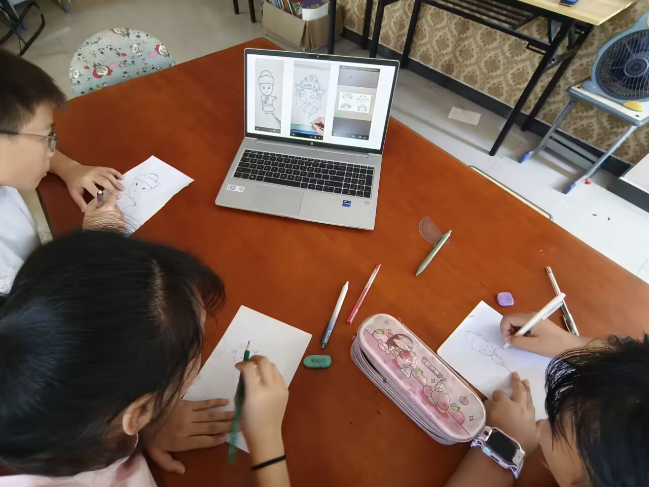 繪畫創(chuàng)作環(huán)節(jié)是活動核心。宣講人方偉紅給每個孩子發(fā)放畫紙和彩筆,鼓勵他們畫出心中的黃梅戲形象。孩子們熱情高漲,專注描繪旦角細(xì)膩妝容與飄逸服飾,大膽表現(xiàn)武生英姿颯爽,還有孩子發(fā)揮創(chuàng)意,將黃梅戲元素與現(xiàn)代生活結(jié)合,創(chuàng)作出獨具特色的作品。教室里彌漫著創(chuàng)作熱情與歡樂氣息,孩子們沉浸在自己的藝術(shù)天地。