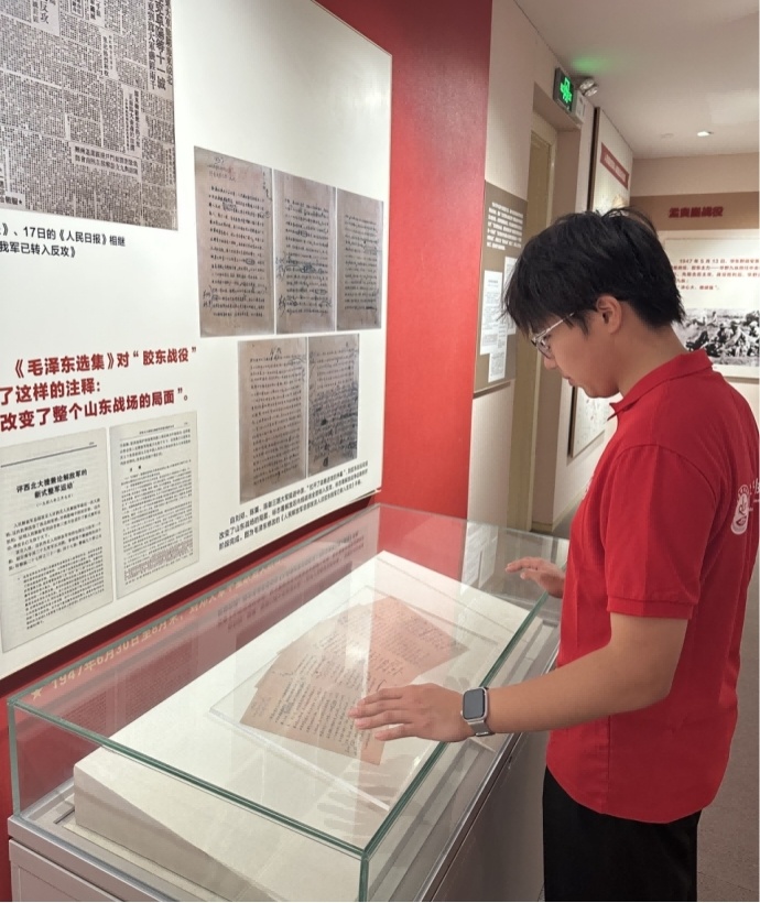 從泛黃的歷史照片到銹跡斑斑的武器,從珍貴的手稿到復(fù)原的革命場景,每一件展品都仿佛在訴說著膠東人民為民族獨立和人民解放所做出的巨大犧牲與卓越貢獻。每一處細節(jié)都讓成員們感受到歷史的厚重與革命先烈的偉大。在“英雄膠東”展區(qū),實踐團成員駐足于“馬石山十勇士”的展板前,被勇士們在烽火連天中為保護群眾與敵人殊死搏斗、壯烈犧牲的精神深深震撼。講解員動情地講述著那段歷史,成員們仿佛穿越時空,回到了那個戰(zhàn)火紛飛的年代,感受到了革命先烈們堅定的信仰與無畏的勇氣。