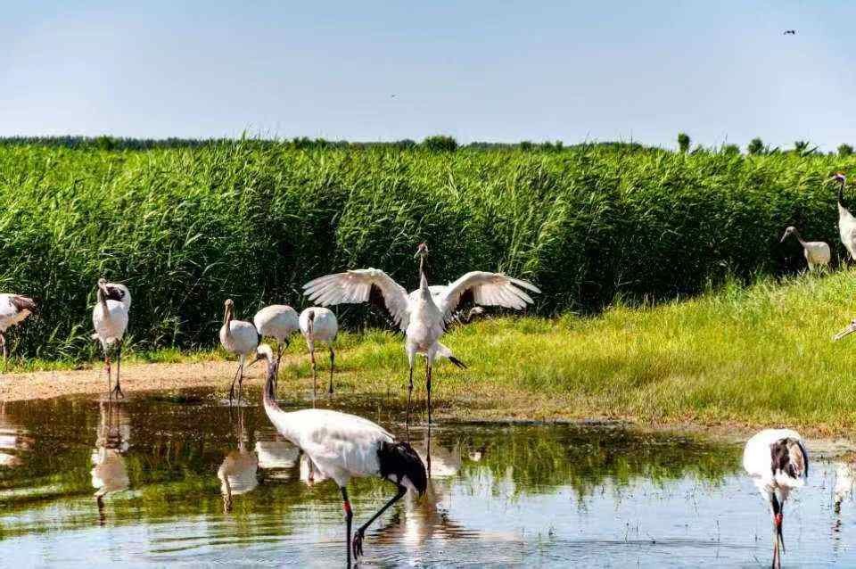 結(jié)束泰來縣的實(shí)踐后,實(shí)踐隊(duì)前往扎龍國家級(jí)自然保護(hù)區(qū)開展?jié)竦厣鷳B(tài)考察。在這片21萬公頃的濕地上,棲息著全球五分之一的丹頂鶴種群。團(tuán)隊(duì)成員此行恰好趕上“丹頂鶴放飛”的環(huán)節(jié),隊(duì)員們認(rèn)真觀察記錄丹頂鶴、白頭鶴、白枕鶴等珍稀動(dòng)物的外觀特征及棲息情況并對濕地保護(hù)知識(shí)有了進(jìn)一步的了解。
