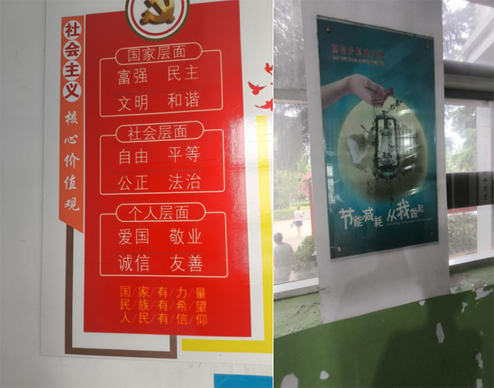 在高村鄉(xiāng)黨群服務(wù)中心,習(xí)近平新時(shí)代中國(guó)特色社會(huì)主義核心價(jià)值觀得到了淋漓盡致的體現(xiàn)。從走廊上關(guān)于節(jié)能減排的宣傳,到二樓醒目的“不忘初心牢記使命”大字,每一處細(xì)節(jié)都彰顯著制度自信。其中,“忘”字上面將“人”放在心上的巧妙設(shè)計(jì),更是凸顯了政府時(shí)刻把人民放在心中的責(zé)任感。