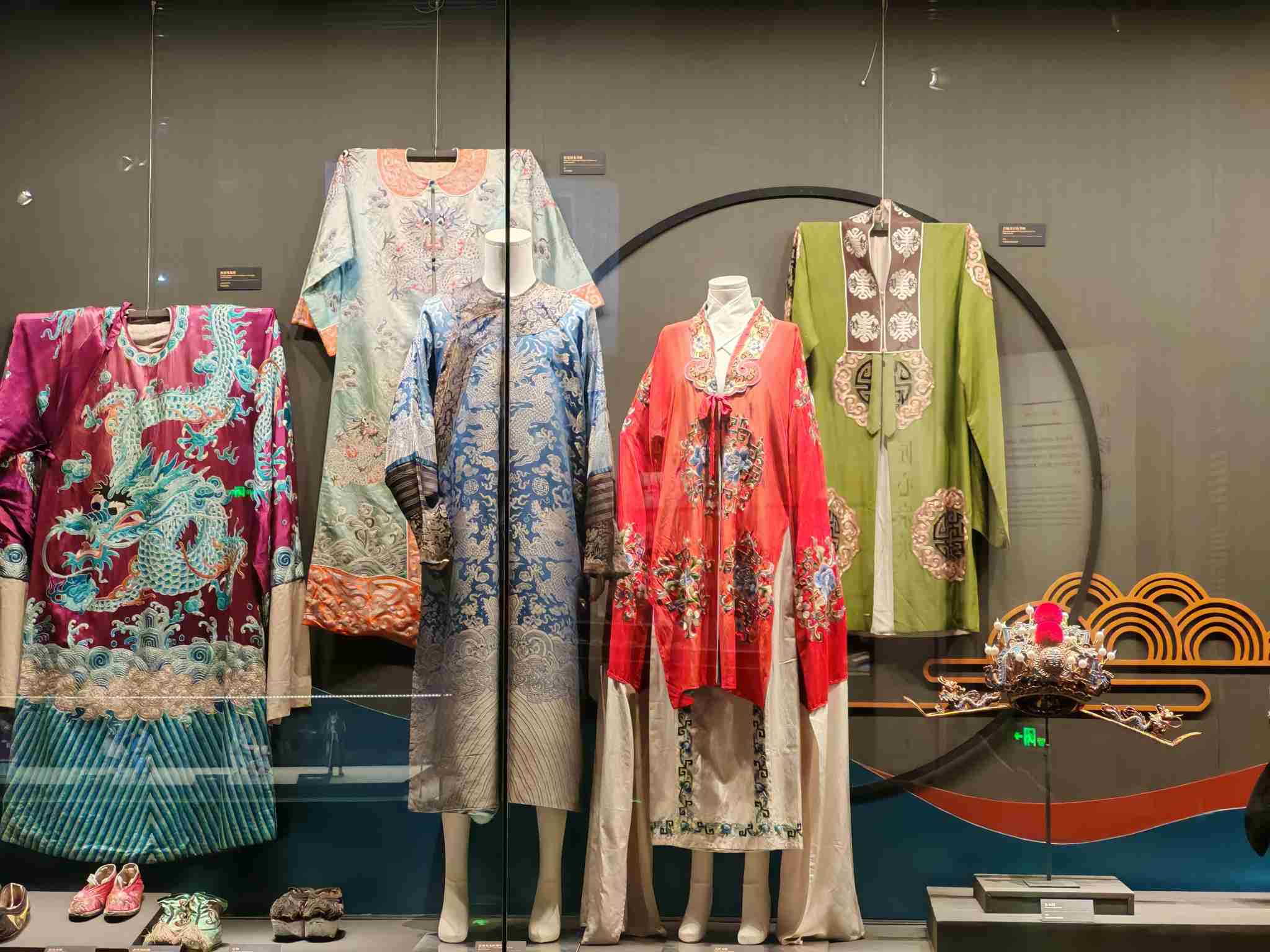 另一邊,《夫妻觀燈》中王小六的粗布短褂則透著質(zhì)樸。“你們看這布料是土棉布,顏色是植物染的靛藍(lán)色,袖口還故意做了磨損的毛邊。” 講解員笑著說(shuō),“黃梅戲的服飾講究‘什么樣的人穿什么樣的衣’,帝王將相有華服,農(nóng)夫漁民有布衣,從不脫離角色的身份,這也是它能讓老百姓有共鳴的原因。”