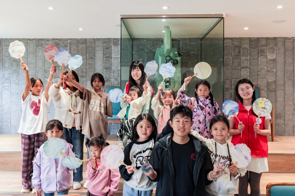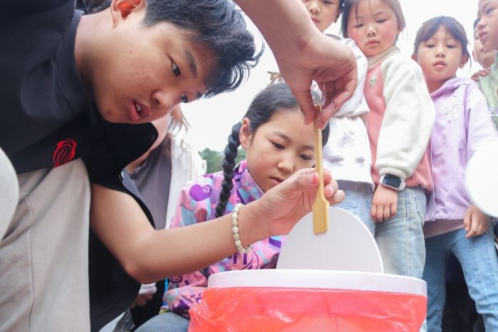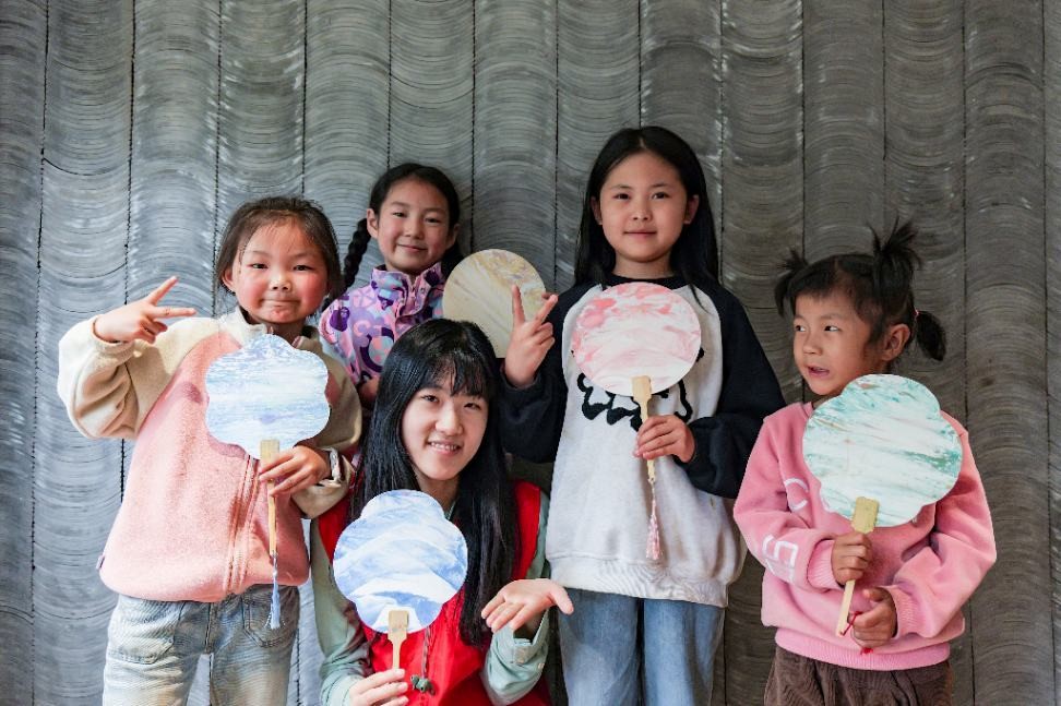7月21日,支教團(tuán)推出《漆韻繪扇》課程,30名孩子置身戶外,屏息凝視志愿者寧亞楠老師手中的素面絹扇。"漆如時(shí)光,層層沉淀方顯光華",寧老師輕撥漆桶中的斑斑色帶,"今日以扇為紙,以漆為墨,畫出山間的流云與清風(fēng)!"