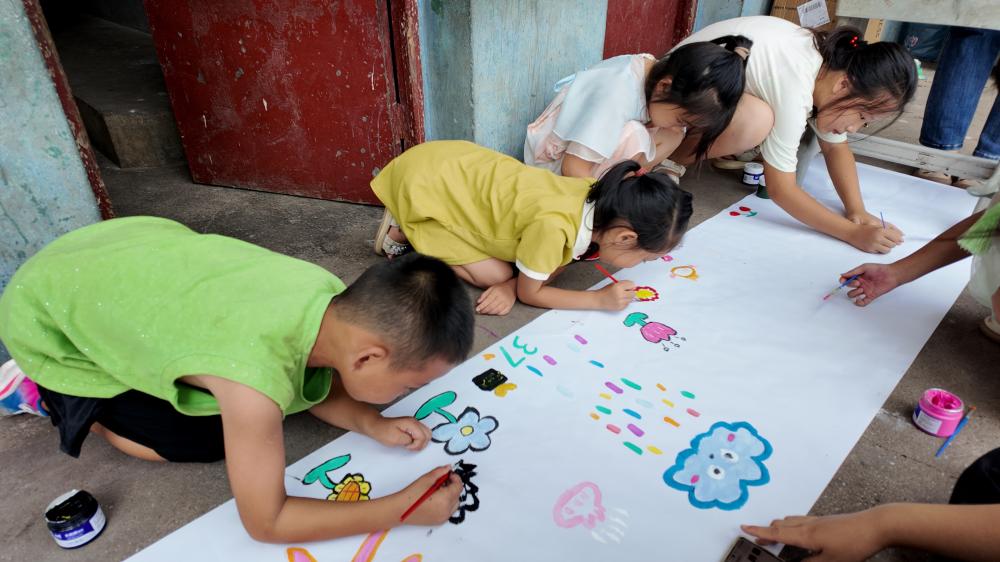 隨后的“共繪夏令營(yíng)”活動(dòng)中,志愿者與孩子們共同拿起畫筆創(chuàng)作長(zhǎng)幅畫作,“望曦”“七朵有彩花”“快樂大本營(yíng)”等元素在五彩顏料下綻放,每一筆都飽含留戀,大家圍繞長(zhǎng)卷合影,定格協(xié)作的快樂與珍貴瞬間。