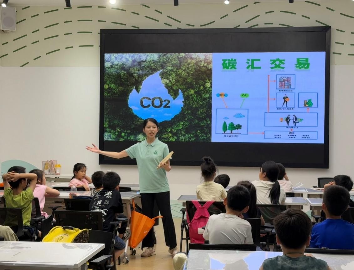 實踐團成員身著綠色文化衫,手持《竹譜詳錄》古籍復(fù)刻本走上講臺,屏幕上“綠水青山就是金山銀山”的竹海背景瞬間點亮孩子們的目光。首先,實踐團成員以鄭燮《竹石》為引,用動畫演示竹子扎根破巖的生長周期,結(jié)合小古城村茶山生態(tài),講解浙農(nóng)林大茶學(xué)專業(yè)如何用科技守護“一片葉子”;隨后,實踐團用“全球首座竹林碳通量塔”模型演示碳匯監(jiān)測原理,結(jié)合“碳匯交易”動畫,把專業(yè)知識轉(zhuǎn)化為趣味故事,引起小朋友們的一片驚呼;最動人的環(huán)節(jié),是“竹夢明信片”互動。孩子們用彩筆描繪心中的“竹科技”。這場45分鐘的課堂,不僅是知識傳遞,更是青春火種的播撒——當(dāng)小古城的孩子把大學(xué)夢種進心底,鄉(xiāng)村振興的人才接力,已悄然開啟新篇。