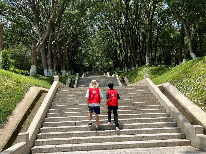 10時許,團隊成員走向烈士紀念碑。157級臺階被烈日曬得發(fā)燙,隊長張子恒提醒:前面還有11層主陵臺階,大家調整呼吸,聆聽歷史的聲音。方志敏烈士陵園的11層臺階象征著方志敏為共產主義奮斗的11個春秋,即從他投身革命到犧牲的漫長歷程,每層臺階代表方志敏為革命奮斗的一個春秋,而每級臺階則對應他在贛東北特區(qū)蘇維埃政府擔任主席至犧牲時的1570個日日夜夜。這種設計通過數字的疊加,凸顯了方志敏為革命事業(yè)奉獻的堅定信念和漫長歲月。