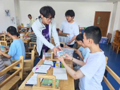 實(shí)踐期間,團(tuán)隊(duì)結(jié)合兒童特點(diǎn)開展多項(xiàng)活動(dòng)。繪畫教學(xué)中,楊誠嘉帶領(lǐng)兒童進(jìn)行基礎(chǔ)創(chuàng)作,丁俊協(xié)助分發(fā)工具,幫助包括盲童在內(nèi)的特殊兒童完成首次繪畫嘗試;手工環(huán)節(jié),葉珍兒通過手把手指導(dǎo),幫助孩子們掌握疊愛心技巧,提升其動(dòng)手能力;作業(yè)輔導(dǎo)時(shí),李文豪用生活化案例講解數(shù)學(xué)應(yīng)用題,王天天則通過標(biāo)注五角星等方式肯定兒童的作答成果,增強(qiáng)其學(xué)習(xí)信心。
