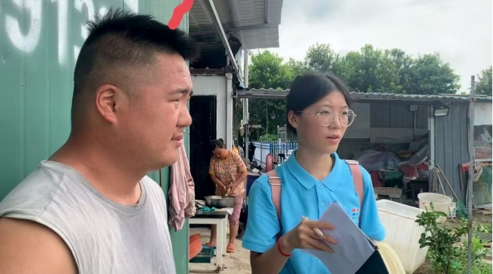 (實(shí)踐團(tuán)成員與養(yǎng)殖戶交談 通訊員攝)