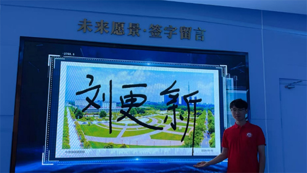 實(shí)踐隊(duì)員劉更新在“未來愿景”展區(qū)電子屏上簽字