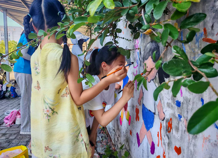 午后的墻繪體驗(yàn)更添熱鬧。小家伙們蘸著顏料,在墻上印下胖乎乎的手印,有的像小樹(shù)苗,有的像花朵;洗干凈手后,又踮著腳給提前畫好的小人兒添上笑臉,給草叢畫上蝴蝶——翅尖沾著薔薇粉,翅膀點(diǎn)滿金粉,仿佛剛從村口的花叢里飛來(lái)。隊(duì)員們?cè)谝慌孕扪a(bǔ)細(xì)節(jié),看孩子們的創(chuàng)意如藤蔓般在墻面上生長(zhǎng),忽然明白:鄉(xiāng)村的未來(lái),本就該這樣充滿想象。
