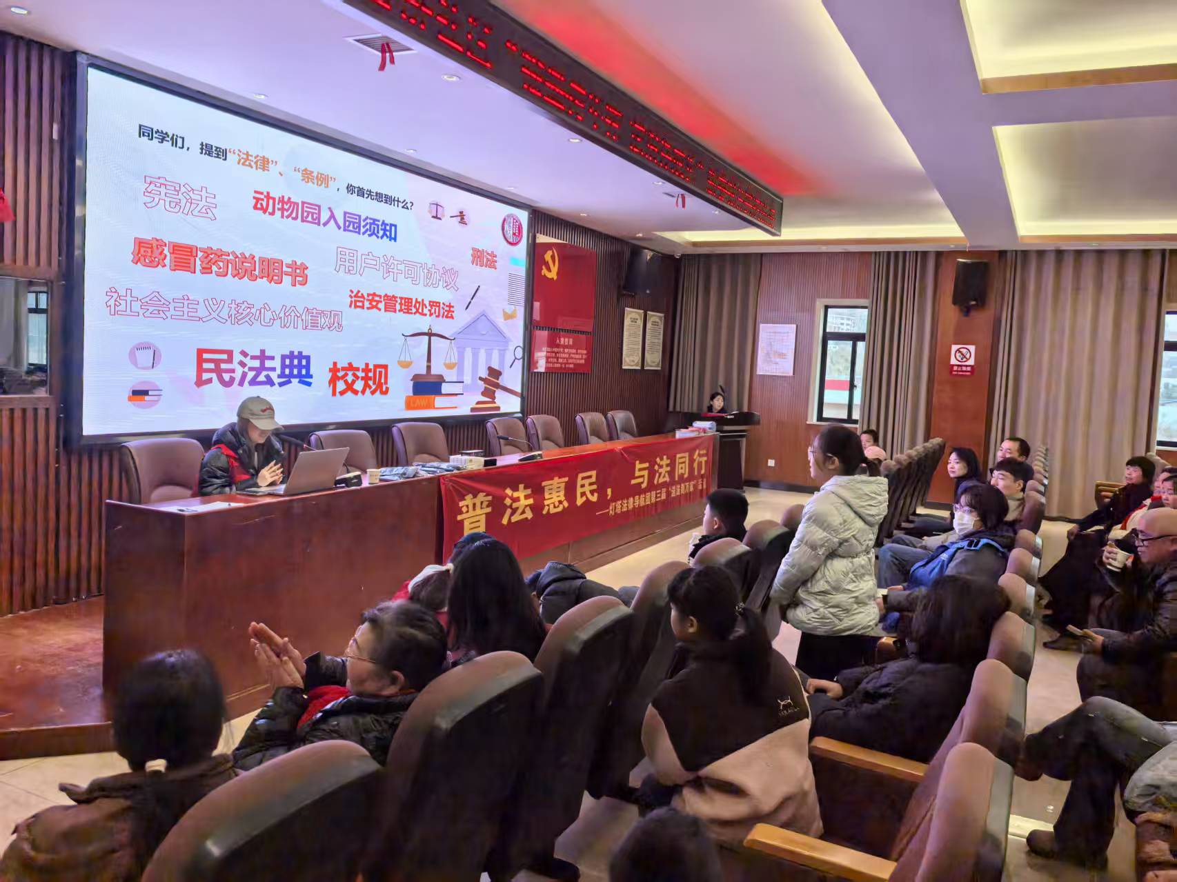 活動(dòng)首站設(shè)在了社區(qū)活動(dòng)中心。一場(chǎng)面向青少年的專題普法講座在此舉行,主題聚焦“以法護(hù)心,以愛護(hù)苗”。來自“燈塔法律導(dǎo)航團(tuán)”的大學(xué)生講師,用通俗易懂的語(yǔ)言和貼近生活的案例,深入淺出地講解了《憲法》賦予公民的基本權(quán)利與義務(wù),并結(jié)合《未成年人保護(hù)法》,詳細(xì)剖析了未成年人享有的合法權(quán)益、如何識(shí)別與應(yīng)對(duì)校園欺凌、以及預(yù)防未成年人犯罪等關(guān)鍵議題。講座還及時(shí)解讀了《治安管理處罰法》中的新近規(guī)定,并引入了《湖南省促進(jìn)心理健康條例》的相關(guān)內(nèi)容,引導(dǎo)青少年關(guān)注自身心理健康,學(xué)會(huì)運(yùn)用法律武器保護(hù)自己。現(xiàn)場(chǎng)不僅坐滿了朝氣蓬勃的青少年,還吸引了社區(qū)老年學(xué)校的學(xué)員前來聆聽,體現(xiàn)了全民普法的濃厚氛圍。講座中穿插的互動(dòng)答題環(huán)節(jié)更是點(diǎn)燃了全場(chǎng)熱情,同學(xué)們爭(zhēng)相舉手、踴躍作答,在輕松愉快的氛圍中將法律知識(shí)牢記心間。