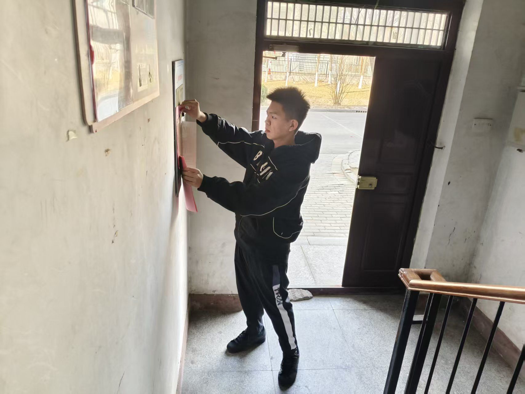 圖為實踐團(tuán)成員在樓道內(nèi)粘貼警示標(biāo)語