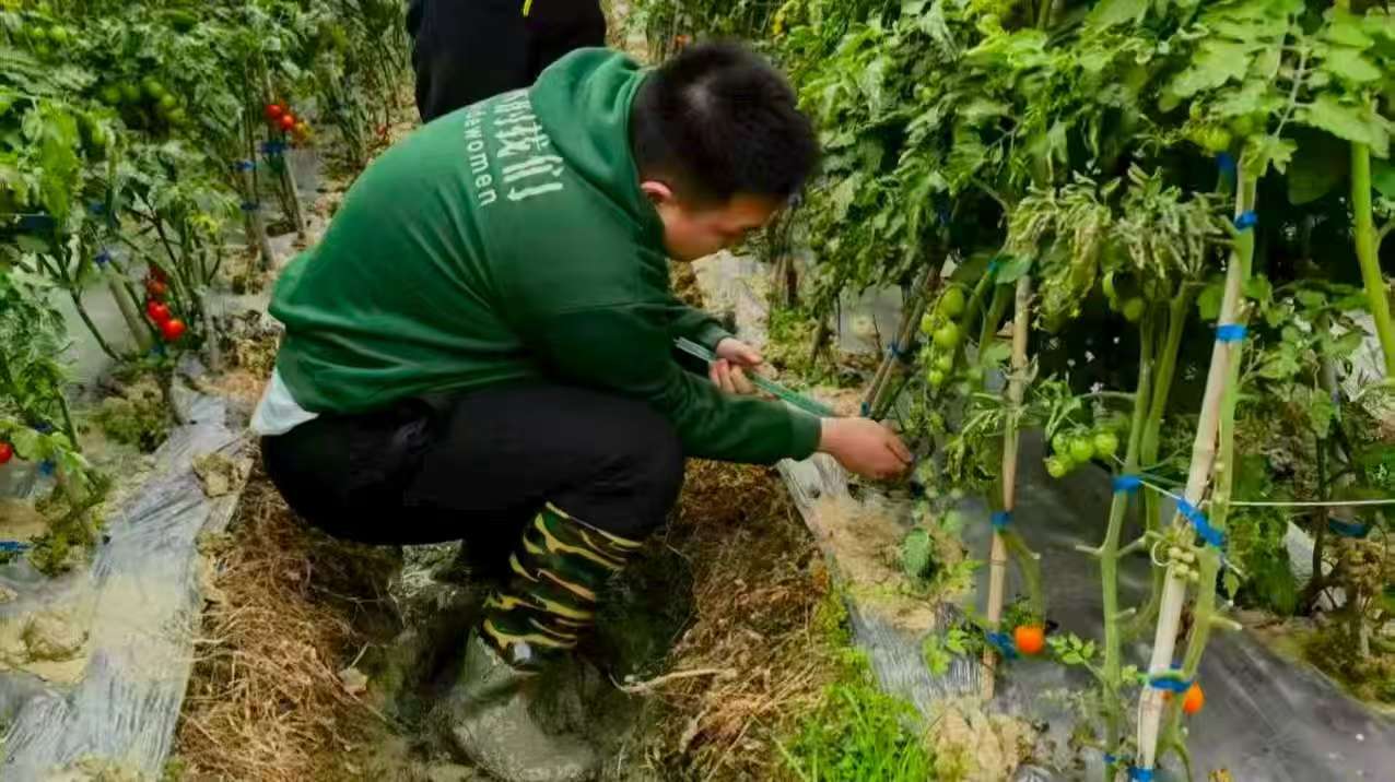 圖為成員關(guān)振洲在番茄田間測量數(shù)據(jù)的拍照