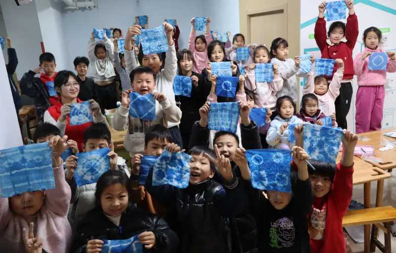 圖為孩子們與成員們的扎染效果展示 郝一諾 供圖