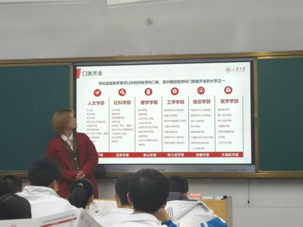于冬日晚上,在高三班主任的帶領(lǐng)下,我們回訪小組準(zhǔn)時(shí)進(jìn)入班級(jí)宣講。黑板上留著課代表歪歪扭扭的字跡讓我倍感親切,臺(tái)下稚嫩又充滿朝氣的少年面龐讓我回憶當(dāng)年。正式宣講前,我們把招協(xié)準(zhǔn)備的宣傳物資分發(fā)給了學(xué)弟學(xué)妹們,宣傳冊(cè)、海報(bào)等。臺(tái)下同學(xué)的歡呼聲和掌聲,以及偷偷低下頭的竊竊私語,不禁讓我想起之前的我在高中時(shí)聽學(xué)長學(xué)姐宣講時(shí)的模樣,好奇又期待,還充斥著對(duì)未來的幻想。與此同時(shí),這樣的氛圍給了我莫大的鼓勵(lì),讓我能夠滿懷信心和力量,更好地執(zhí)行我們的“黔山筑夢(mèng),山大啟航”回校宣講活動(dòng)。