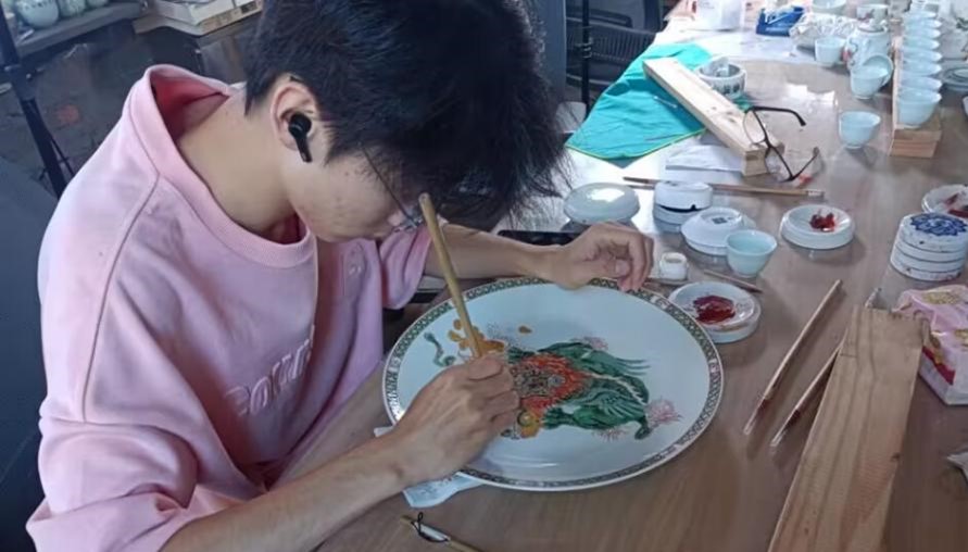 圖為社會實踐隊員為紅綠彩瓷器上色。中國青年網(wǎng)通訊員 王德馨 供圖