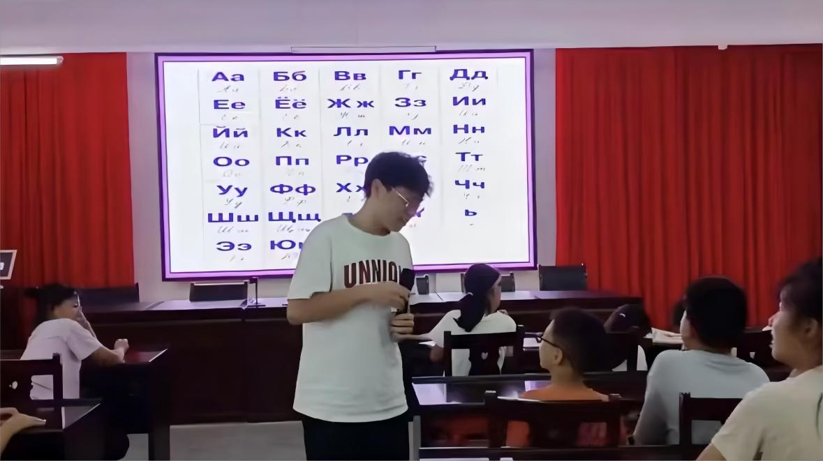 隨后,志愿者方子恒老師以一種循序漸進(jìn)的方式,從俄語(yǔ)字母的基礎(chǔ)開(kāi)始,逐步深入到俄語(yǔ)單詞的層面,細(xì)致地講解了每一個(gè)字母的發(fā)音和書寫規(guī)則,以及如何將這些字母組合成有意義的單詞。他耐心地引導(dǎo)同學(xué)們掌握每一個(gè)細(xì)節(jié),確保他們能夠正確地理解和運(yùn)用這些基礎(chǔ)知識(shí)。通過(guò)反復(fù)多次的領(lǐng)讀,同學(xué)們逐步熟悉再到掌握字母和單詞的音與形,同學(xué)們?cè)诎l(fā)音上和拼寫上有了顯著的提高,朗讀時(shí)也變得更加自信。