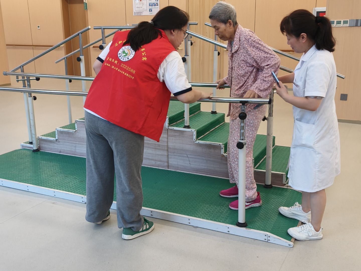 圖為志愿者輔助老人做康復訓練。丁潔 供圖