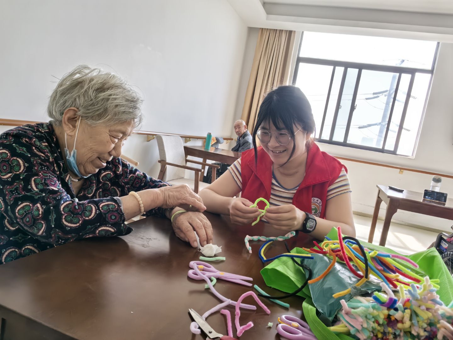 圖為志愿者陪失智老人玩扭扭棒。程宋漫 供圖