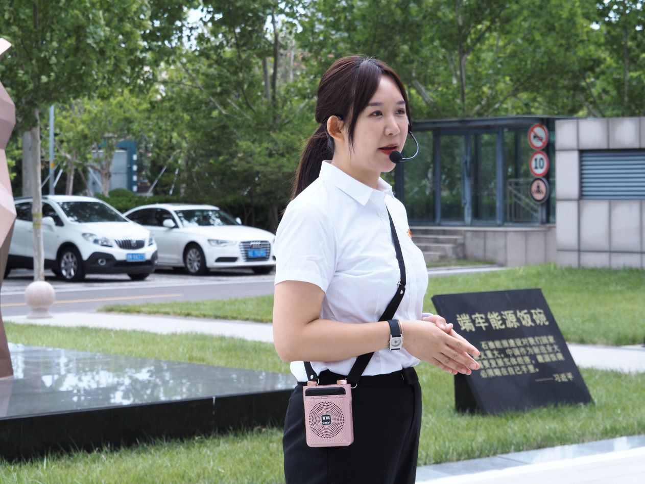 最后,講解員帶領(lǐng)大家移步于廣場(chǎng),為大家講述了廣場(chǎng)上兩座雕像的寓意及相關(guān)背景。其中,“端牢能源飯碗”雕像手掌捧著石油芳烴,其分子式體現(xiàn)能源飯碗掌握在自己手中,雕像呈V字造型,既代表勝利英文首字母,也象征在端牢能源飯碗征程上取得的一項(xiàng)又一項(xiàng)勝利。西邊的“利智先行”雕像,源自王獻(xiàn)之書(shū)寫(xiě)的“一”字,經(jīng)藝術(shù)加工呈現(xiàn)出逆齡前行的形象,代表科研人員不怕困難、克服困難的精神面貌。“端牢能源飯碗”雕像與“利智先行”書(shū)法石刻遙相呼應(yīng)。此外,講解員還提到,總書(shū)記曾在該廣場(chǎng)與兩百多名科研人員親切交流并發(fā)表重要講話,強(qiáng)調(diào)石油戰(zhàn)線始終是共和國(guó)改革發(fā)展的一面旗幟,要繼續(xù)舉好這面旗幟,在確保國(guó)家能源安全和端牢能源飯碗上再進(jìn)攻、再創(chuàng)佳績(jī)。