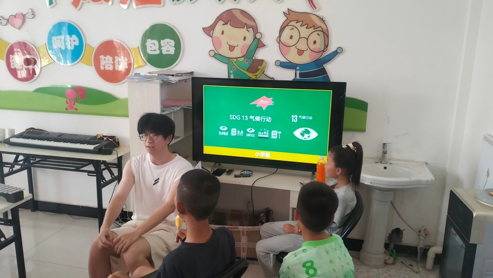 上午的第二節(jié)課,支教隊為孩子們帶來了一場生動有趣的“氣候行動”科普講座??紤]到孩子們的接受能力,隊員們用通俗易懂的語言和豐富的圖片、視頻,講解了全球變暖、極端天氣、碳排放等概念。